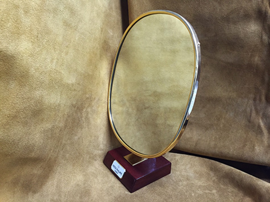 Vintageの雰囲気をもつディスプレイミラーが入荷しています。 フレームはゴールドメッキ、ベースはマホガニーになります。USED品になります。